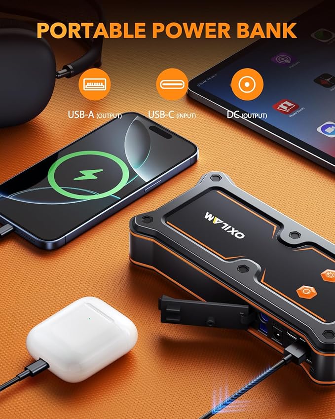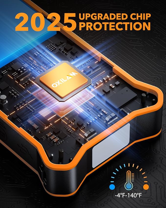 - 【Most Powerful Battery Jump Starter】OXILAM battery jumper starter portable features a powerful 8000 A current that can instantly jump start 12V vehicles, including all gas and diesel engines, even at -4~140℉. A single full charge supports at least 80 starts. With its smart voltage analysis feature, expect hassle-free vehicle startups every time—no external booster is required