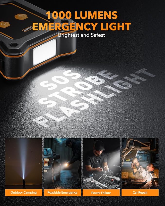 - 【Portable Design and 1000 LM LED Flashlight】The portable car jump starter fits perfectly into the corner of your car or backpack, portable and ready to use at any time. The jump pack features a 3-mode multi-function LED flashlight (lighting/flash/SOS). With up to 1000 lumens of brightness, providing 100% visibility at night. It can be used continuously for 120 hours. In emergencies, this jump box for car battery is a reliable lifesaver in the dark when camping, hiking, or adventuring