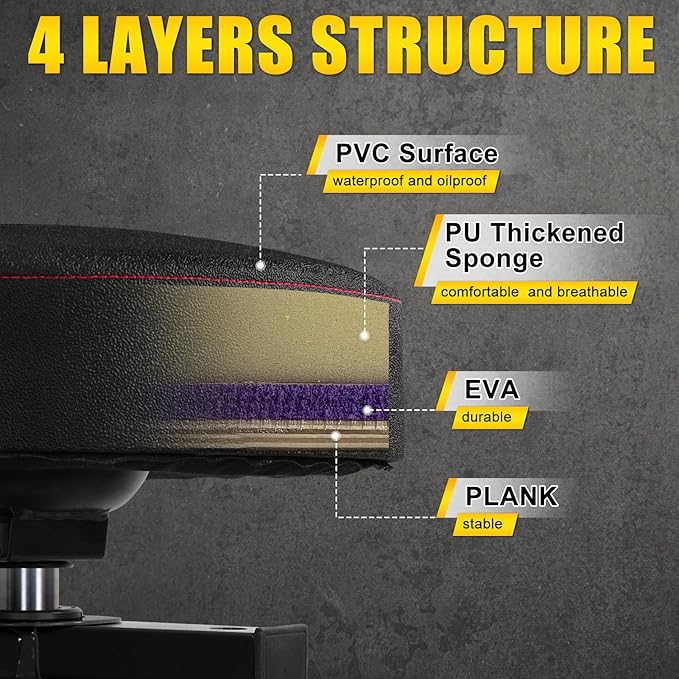 - 【4 layers Structure】The mechanic chair's thick cushion is 3.74"/9.5cm height and consists of FOUR layers structure. The first layer is a solid wooden plank, the second layer is a durable EVA, the third layer is a comfortable and breathable PU thickened sponge, and the fourth layer is a waterproof and oilproof PVC surface. Soft, Firm, and Comfortable. Make it easy to be cleaned
