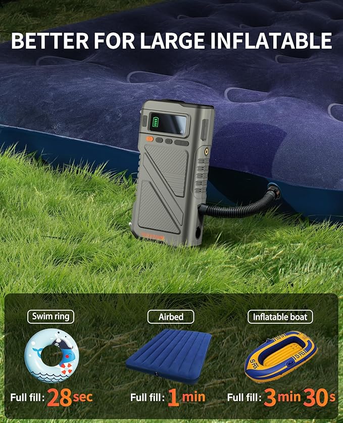 - Unique Air Input & Output Port Design for Large Inflatables: Ulike traditional jump pack with air compressor only for inflation for tires or balls, the jump pack equipped with additional air pump especially to inflat and deflat the mattress beds, boats, swimming ring ect, up to 150PSI. It's a great tool whether you're garden entertaining or traveling outdoors