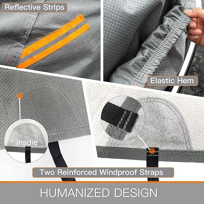 - 【Unique Design】-1 driver's door zipper for easy access. 2 The front and rear wind belts can fix the car cover in strong wind. 3 6 transverse orange reflective strips to remind others at night. 4 mirror pockets make the lid fit better. 5 The charging position on the left side of the car has a cover that is opened, allowing you to easily charge at any time. 6 Make a mesh at the front of the car to facilitate air circulation during charging.
