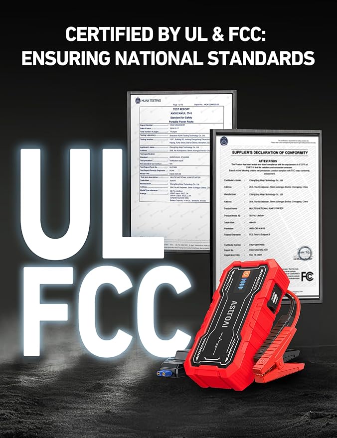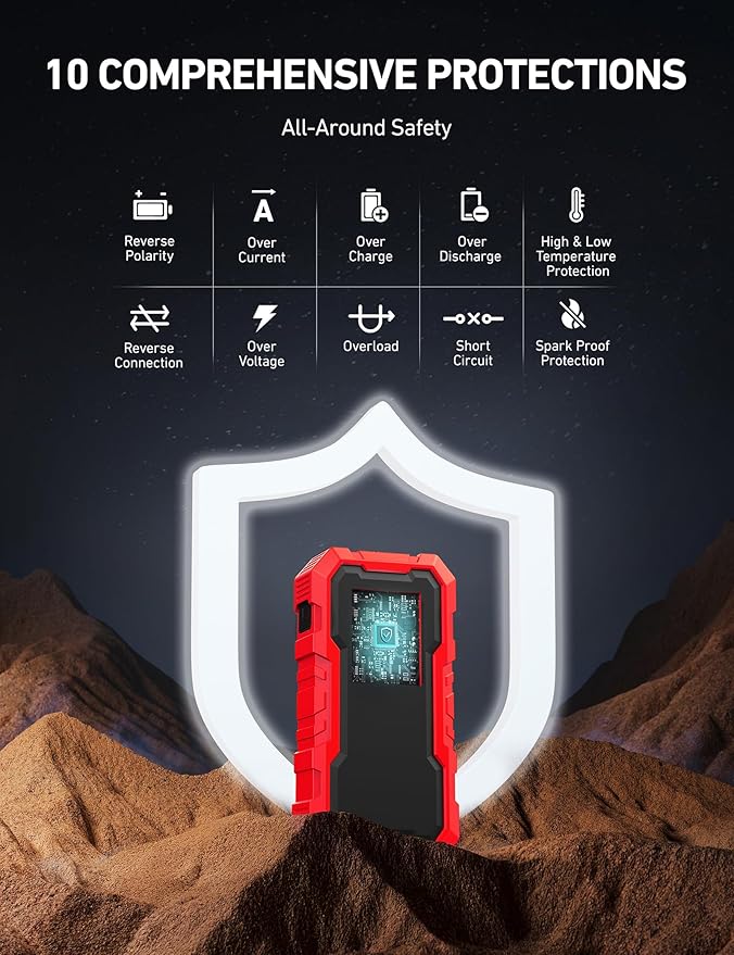 - EXTRA SAFETY - This jump starter is equipped with 10 safety protections, including reverse polarity, overcurrent, overcharge, overdischarge, high & low temperature, reverse connection, over voltage, overload, short circuit, and it’s spark proof. Ultra-safe and easy to use.