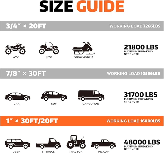 - HEAVY-DUTY RECOVERY ROPE :1inch x 20 foot kinetic recovery rope with a max breaking strength of 48000lbs and 16000lbs work load limit,can be easily recovering and towing a Jeep, ATV, SUV, Pickup,Tractor, Truck and more