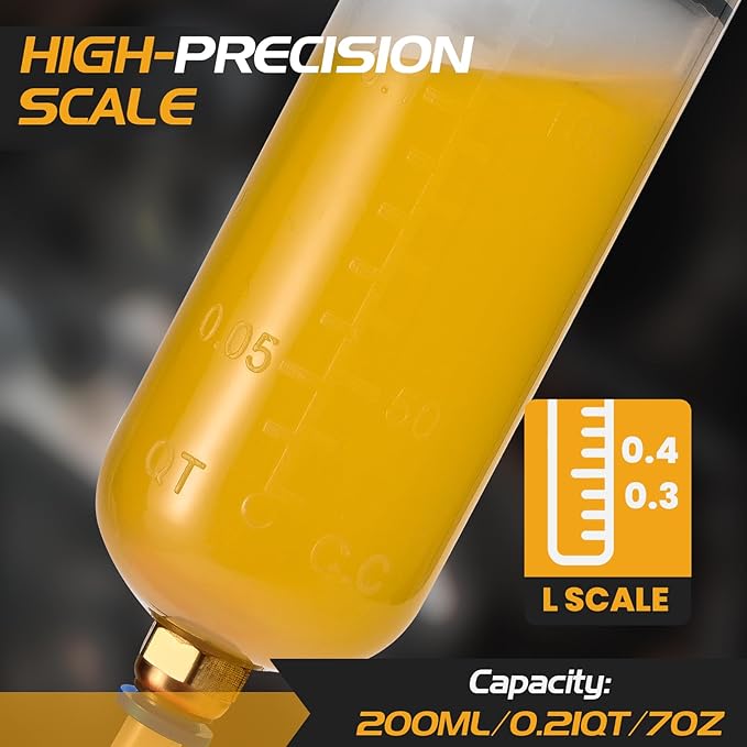 - Durable Construction: Crafted from premium, durable PP material, this automotive syringe is built for reliable performance. The self-locking copper connector ensures a secure attachment to the tube, preventing it from detaching during operation. The transparent body of the suction pump features clearly marked scales for precise monitoring of fluid levels.