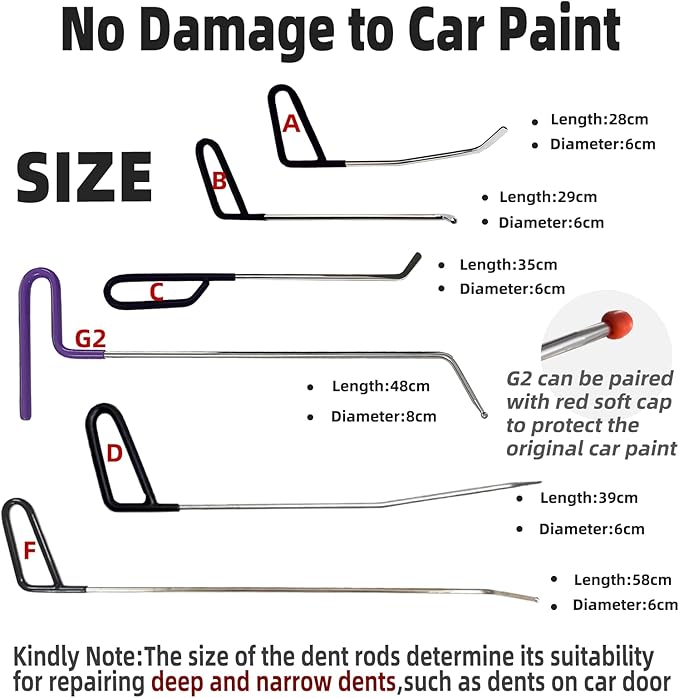 - 【No Damage to Car Paint】The G2 dents rods is also equipped with Red Soft Cap, which allows you to repair the car without damaging the original paint Keep the original car paint, restore the original appearance of the paint surface, and your car can be perfectly repaired even if with paint protective film