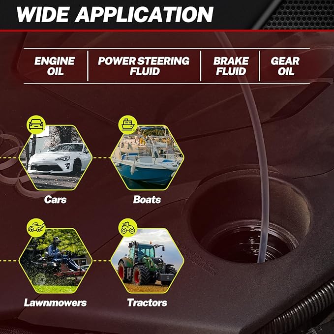 - No Lifting or Crawling Needed: Simplify your oil changes without the hassle of lifting vehicles or crawling underneath. This oil change pump extractor offers a mess-free, user-friendly experience, whether in the garage or outdoors on automotive, boats, trucks, and lawnmowers.