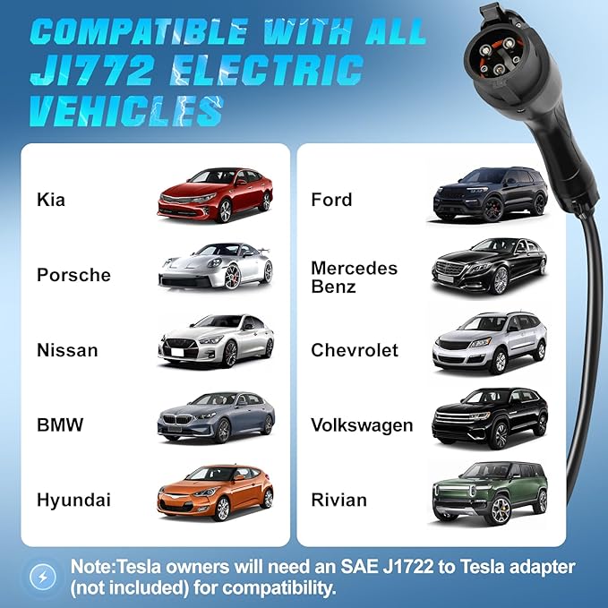 - Universal Compatibility: This J1772 charger is universally compatible with all electric vehicles adhering to the J1772 standard, encompassing models from BMW, Ford, Honda, Hyundai, Kia, Porsche, Nissan, and Chevy, making it a versatile and convenient charging solution for a wide range of EVs.