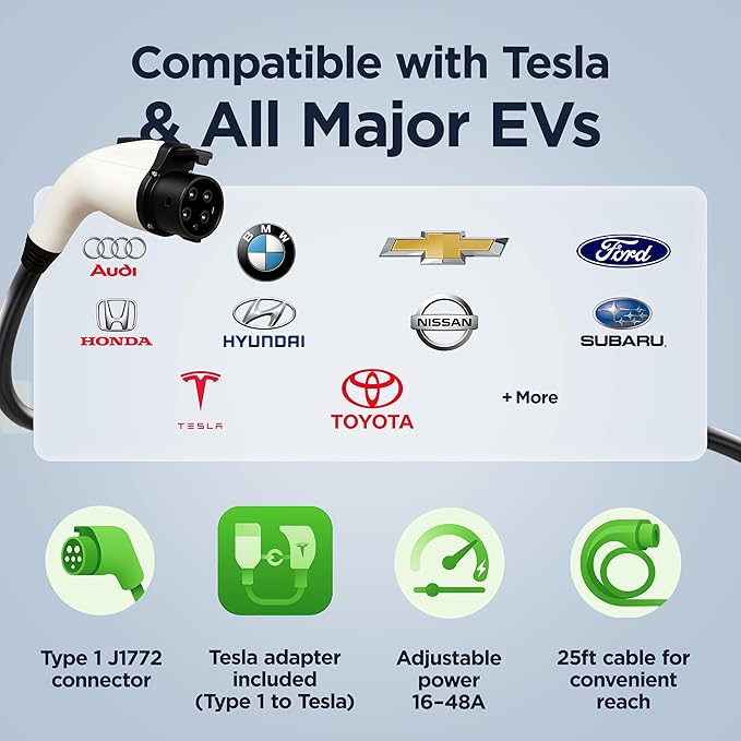 - 25FT CABLE with IP67 Safety Built: The 25-ft EV charging cable gives you plenty of room to work, no matter where your charge port is located or how your garage is arranged. Built to handle real-world conditions with IP67 water resistance, full dust and dirt protection, and safe operation in extreme temperatures (up to +122°F and down to -22°F). We recommend using 6 AWG wiring for the power outlet to ensure maximum output for EV charging.