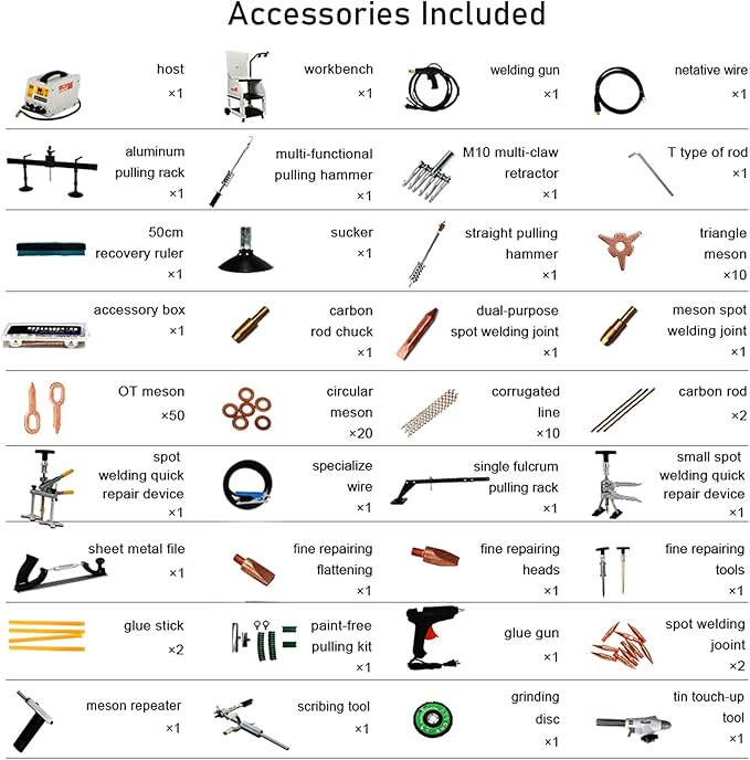 - Useful Accessories Included: This welding dent puller comes with a comprehensive set of accessories, designed to address various vehicle dent issues. The included professional tool cart allows for storing sheet metal tools at any time, making it more convenient to use it anywhere