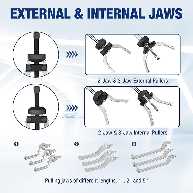 - Puller Adaptability: The two-jaw puller reaches deep into narrow spaces to pull internal components, while the three-jaw puller securely pulls external components. Available with 1-, 2-, or 5-inch jaws, it offers flexible removal of bearings, gears, and seals