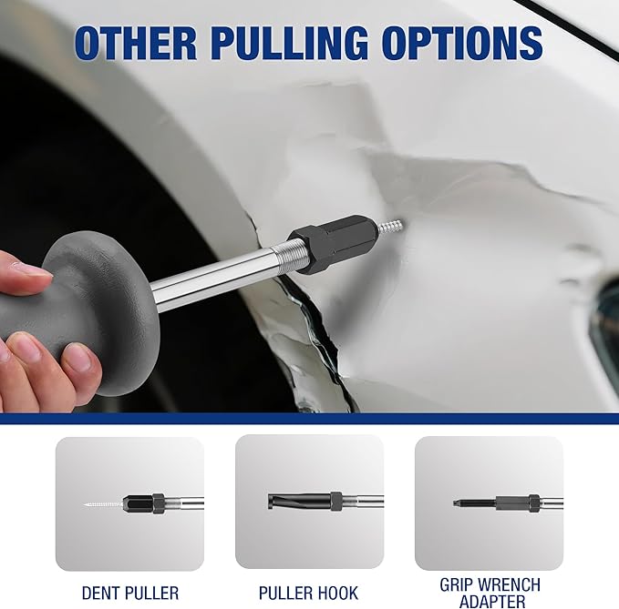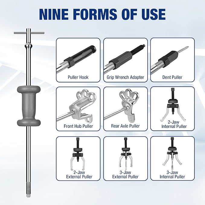 - Versatile Design: This 27-piece set unlocks 9 uses for the slide hammer puller. It can remove flanged rear axles, front-wheel drive wheels, and repair dents—all for home, auto, and emergency repairs—with one tool to meet all your needs