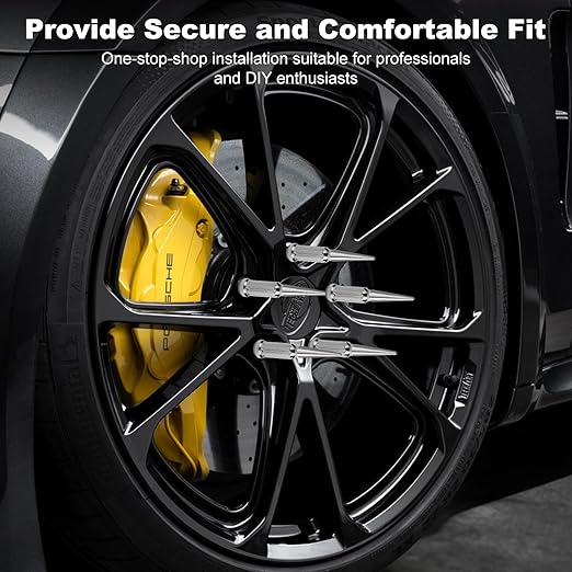 - Precise Specifications:Thread Pitch: 1/2‘’-20; Length: 4.4" (112mm); Diameter: 0.9'' (23mm); Set of 24 closed-end spike lug nuts with a sleek black electrophoresis finish. Ensures a secure fit and enhances your vehicle’s safety and appearance