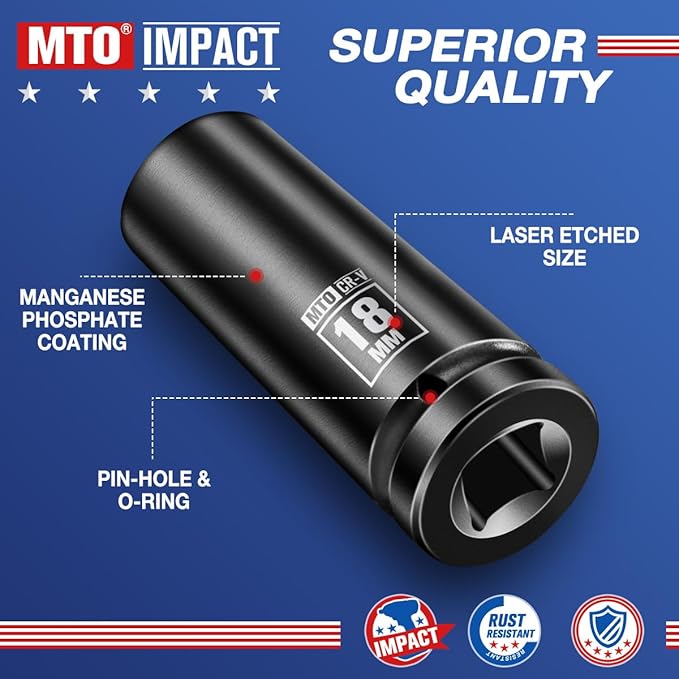 - Durable CR-V Steel: Made from high-quality Chromium-Vanadium (CR-V) alloy steel, MTO 18mm deep impact socket offers reliable strength and durability for everyday tasks. The CR-V material resists wear and tear under regular torque, making it well-suited for automotive repairs, general maintenance, and light to medium-duty construction tasks.