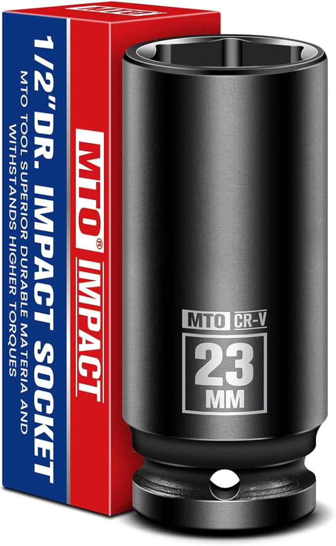 - Compatibility & Versatile Use: Designed for mechanics, contractors, and DIY enthusiasts, MTO 23mm socket fits all standard 1/2" drive impact wrenches, ratchets, and torque tools. Its deep-well design securely grips long bolts on engines, trailers, and agricultural machinery. Made from durable CR-V steel, MTO socket ensures reliable performance for a wide range of applications. SAE-certified dimensions ensure vibration-resistant performance, making it a versatile and essential addition to any toolbox.