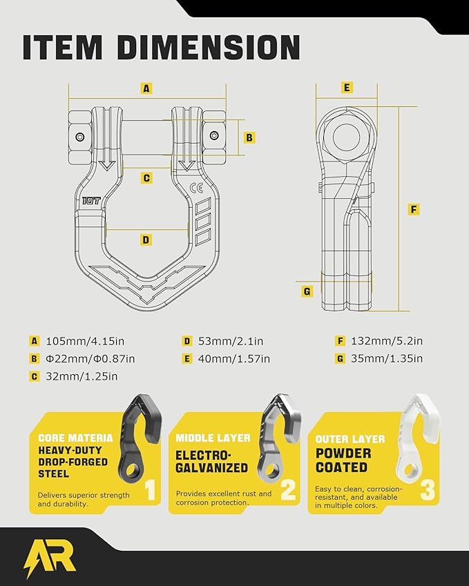 - [Premium Material & Corrosion Resistance] Crafted from heavy-duty drop-forged 40Cr carbon steel, these winch shackles are electro-galvanized and powder-coated for exceptional rust and dirt resistance. Designed for use in mud, sand, or snow, the durable coating ensures long-lasting performance. Available in a variety of solid and dual-colors, touch to complement your vehicle’s aesthetics