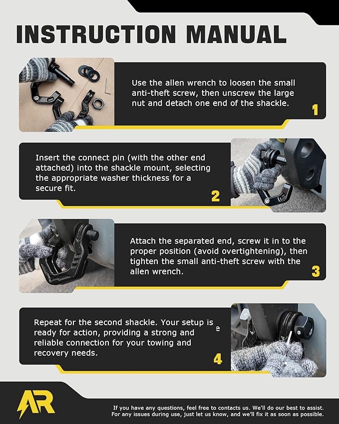 - [Satisfaction Guaranteed] With durable build and innovative design, AUTORICH recovery shackles are the perfect choice for most towing applications. We fully support our product with a satisfaction guarantee, offering a hassle-free return within a month. If you have any questions or concerns, our customer service team is ready to help