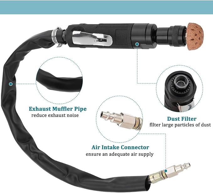 - Easy to use: Low speed grinder uses a platen start-stop switch, which is easy to operate, can be adjusted using a flat screwdriver. The speed ranges from 0 rpm to 2500 rpm.The pneumatic tire repair sets are equipped with a silencer tube to reduce exhaust noise