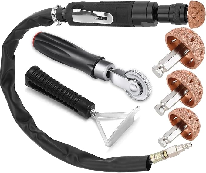 - What can you get: 1 * Grinder, 1 * 20.5 inch Air Pipe, 1 * Air Intake Connector, 1 *38mm Tungsten Steel Grinding Head, 1 * 42mm Tungsten Steel Grinding Head,1 * 55mm Tungsten Steel Grinding Head, 1 * Tire Roller, 1 * Tire Inner Liner Scrapper