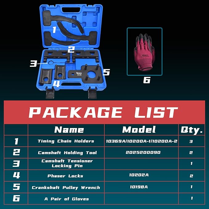 - Package List: 3 x timing chain holders, 2 x phaser locks, 1 x camshaft tensioner locking pin, 2 x camshaft holding tools, 1 x crankshaft pulley wrench and a pair of gloves, all neatly packed in a portable case for easy carrying and storage, making it an ideal In Engine Camshaft Crankshaft Timing Tool Kit.