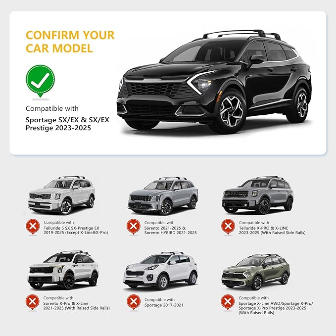 - COMPATIBILITY: This Roof Rack Cross Bar is Compatible with Kia Sportage SX/EX & SX/EX Prestige 2023-2026, Please check the Make, Model and Year of your vehicle before purchasing ! This crossbar is designed specifically for your vehicle, and the specialized style will fit more securely than the universal ones. Anti-theft locking system for security in the outdoors.