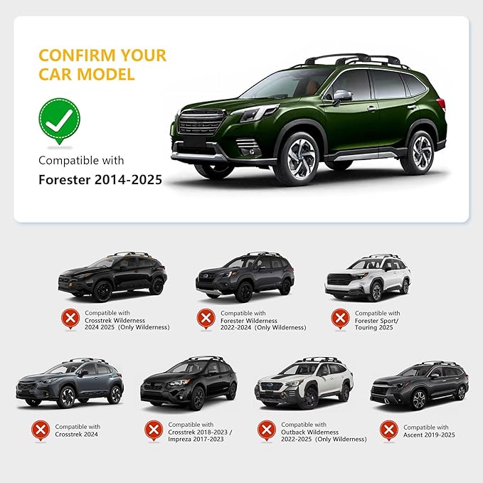- COMPATIBILITY: This Roof Rack Cross Bar is Compatible with Subaru Forester 2014-2026, Please check the Make, Model and Year of your vehicle before purchasing ! This crossbar is designed specifically for your vehicle, and the specialized style will fit more securely than the universal ones. Anti-theft locking system for security in the outdoors.
