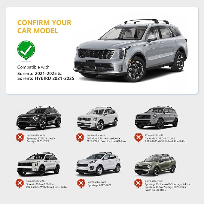- COMPATIBILITY: This Roof Rack Cross Bar is Compatible with Kia Sorento 2021-2026 & Sorento HYBIRD 2021-2026, Please check the Make, Model and Year of your vehicle before purchasing ! This crossbar is designed specifically for your vehicle, and the specialized style will fit more securely than the universal ones. Anti-theft locking system for security in the outdoors.
