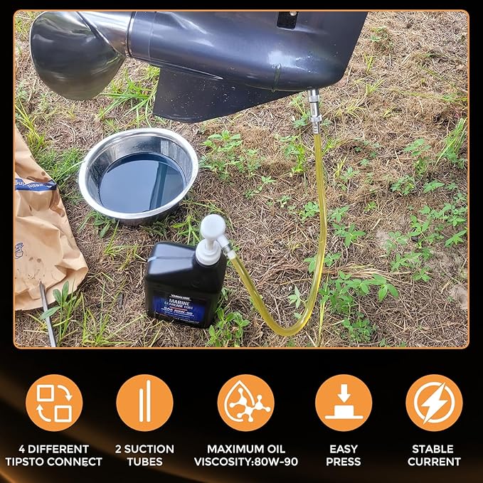 - 3 Adapters Sizes: 3/8" swivel adapter connected to clear plastic tubing. 8mm and 10mm metal adapter fits for most foriegn outboard motor's lower unit drain threads hole.