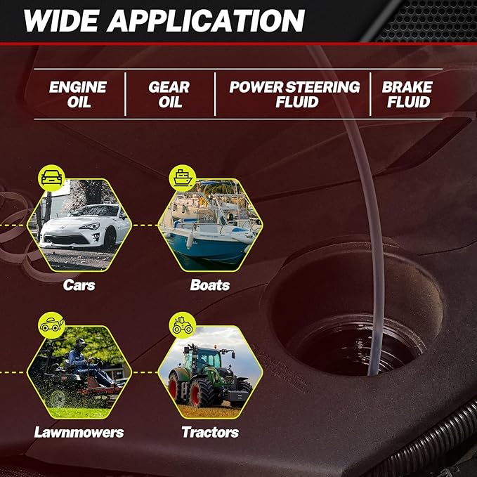 - No Lifting or Crawling Needed: Simplify your oil changes without the hassle of lifting vehicles or crawling underneath. This oil change pump extractor offers a mess-free, user-friendly experience, whether in the garage or outdoors on automotive, boats, trucks, and lawnmowers.