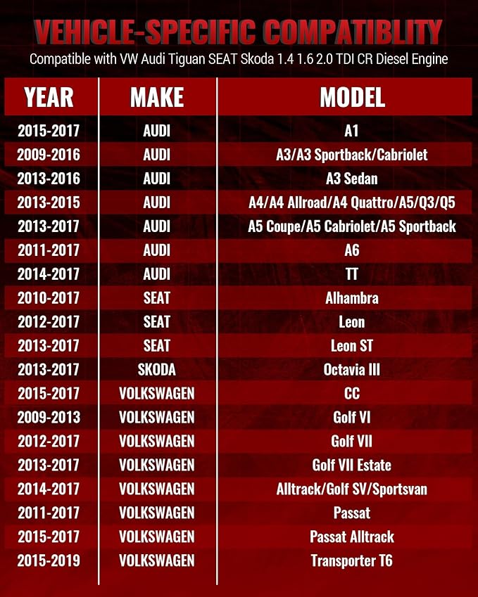 - WIDE APPLICATIONS: This camshaft alignment tool set is compatible with VW Audi Tiguan SEAT Skoda 1.4 1.6 2.0 TDI CR diesel engine vehicle model, Compatible with A1/CC/Passat Alltrack (15-17), A3/A3 Sportback/Cabriolet (09-16), A3 Sedan (13-16), A4/A4 Allroad/A4 Qua-att-ro/A5/Q3/Q5 (13-15), A5 Coupe/A5 Cabriolet/A5 Sportback/Leon ST/Golf VII Estate (13-17), A6/Passat (11-17), TT/Alltrack/Golf SV/Sportsvan (14-17), Alhambra (10-17), Leon/Golf VII(12-17), and Transporter T6 (15-19)