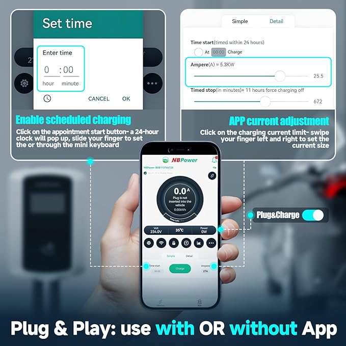 - 【Faster Charging & Maximized Savings】: Up to 7X faster than a standard outlet charger, providing 40 miles of range with every hour of charge.The Home offers adjustable amperage: 48A,40A, 32A, 24A, 16A, The EV charger for home supports APP management and Wi-Fi connectivity, you can adjust the current intensity, schedule charging time, and monitor charging data in real-time. Setting a scheduled charging time during off-peak hours lowers electricity bills and saves you money.