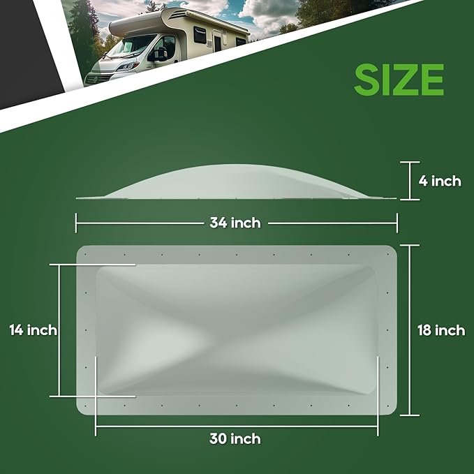 - Universal Fit: 18’’ x 34’’ x 4’’ Outer Dimension Skylight fits all standard 14’’ x 30’’ roof openings. Universal size ensures it’s a perfect replacement for most vehicles on the market, making it an easy upgrade for your existing skylight.