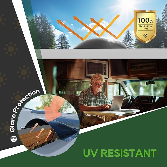 - UV Protected: Our skylight is designed to block 100% of UV rays, ensuring superior protection for you and your RV interior space. With 0% UV transmission, it effectively prevents sun damage, fading, and reduces heat buildup. Whether you’re parked under direct sunlight or on the move, this skylight helps maintain a cooler, safer, and more comfortable environment.
