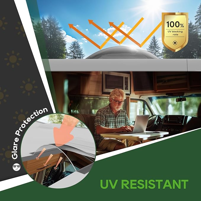 - UV Protected: Our skylight is designed to block 100% of UV rays, ensuring superior protection for you and your RV interior space. With 0% UV transmission, it effectively prevents sun damage, fading, and reduces heat buildup. Whether you’re parked under direct sunlight or on the move, this skylight helps maintain a cooler, safer, and more comfortable environment.