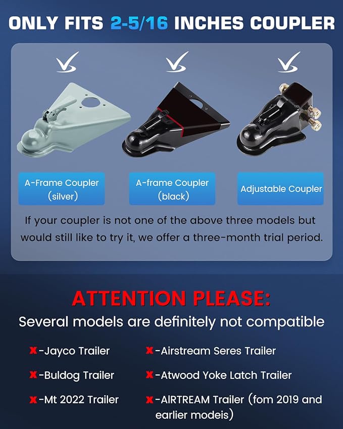 - Compatibility: Trailer lock is specifically designed for 2 5/16 inch trailer couplings, making it ideal for trailers, RVS, and boats. So confirm the connection size before buying to ensure full compatibility with your trailer fastener.