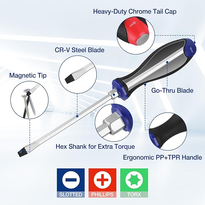 - Heavy-Duty Screwdriver: This screwdriver kit built with a matte chrome finish for superior strength and corrosion resistance; It features a full-length go-thru design that withstands heavy hammering; The hex shank adds extra torque when used with a wrench, making it easy to loosen tight screws