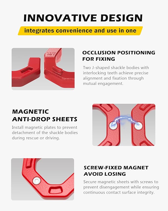 - POWERFUL LOCKING SYSTEM: J-shaped shackle body features an integrated magnetic suction plate, ensuring the halves stay securely connected even on rough terrain. The magnetic pieces are reinforced with screws to prevent dislodging, offering unmatched stability