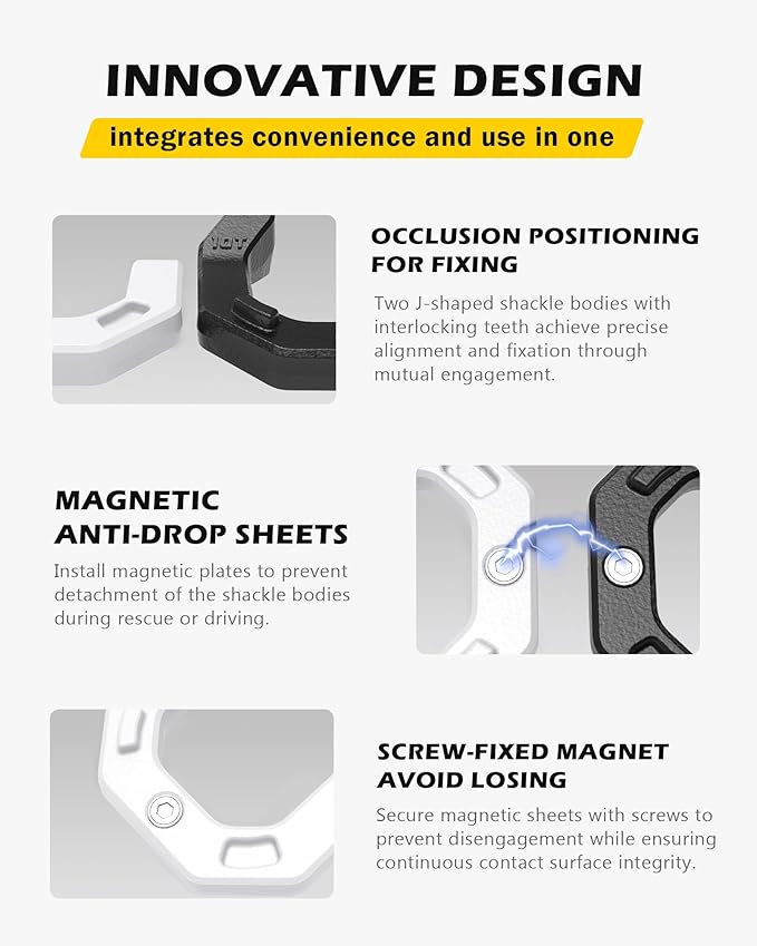 - POWERFUL LOCKING SYSTEM: J-shaped shackle body features an integrated magnetic suction plate, ensuring the halves stay securely connected even on rough terrain. The magnetic pieces are reinforced with screws to prevent dislodging, offering unmatched stability