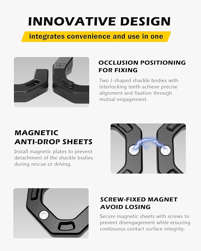 - POWERFUL LOCKING SYSTEM: J-shaped shackle body features an integrated magnetic suction plate, ensuring the halves stay securely connected even on rough terrain. The magnetic pieces are reinforced with screws to prevent dislodging, offering unmatched stability