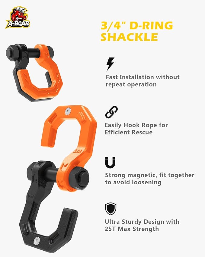 - BUILT TO LAST: Crafted from high-strength alloy steel with anti-corrosion coating, A-BOAR separate dring shackles are ready to tackle mud, rain, snow, and rocky trails. With our magnetic-lock innovation and precision engineering, the separate dring shackle is not just a recovery tool also your ultimate off-road companion