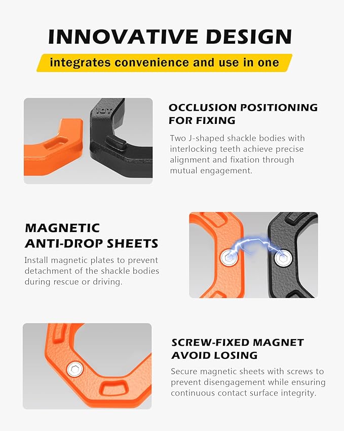 - POWERFUL LOCKING SYSTEM: J-shaped shackle body features an integrated magnetic suction plate, ensuring the halves stay securely connected even on rough terrain. The magnetic pieces are reinforced with screws to prevent dislodging, offering unmatched stability