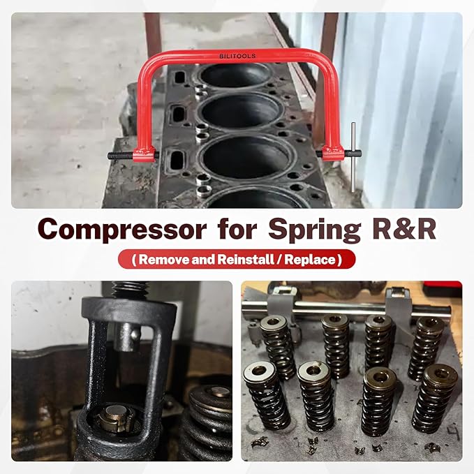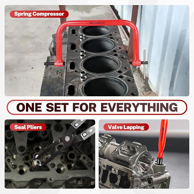 - Comprehensive Kit: The kit includes everything needed for safe valve spring removal/installation: 1x Hand lever, 1x C-Clamp jaw, 3x Extension screws, 5x Pusher adapters, 2x Valve lappers, and a dedicated Straight seal plier, perfectly compatible with most automotive and small engine valve springs and cylinder heads.