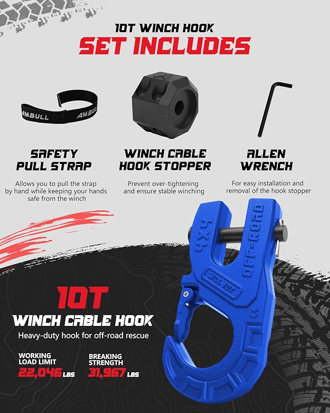 - Dual-Function Hook & Stopper Combo - AMBULL Tow Winch Hook with Cable Stopper set combines a 10T heavy-duty forged steel winch hook with a stopper. The stopper prevents synthetic rope slippage and abrasion, while the clevis clip hook ensures secure load attachment, offering a complete solution for winch protection