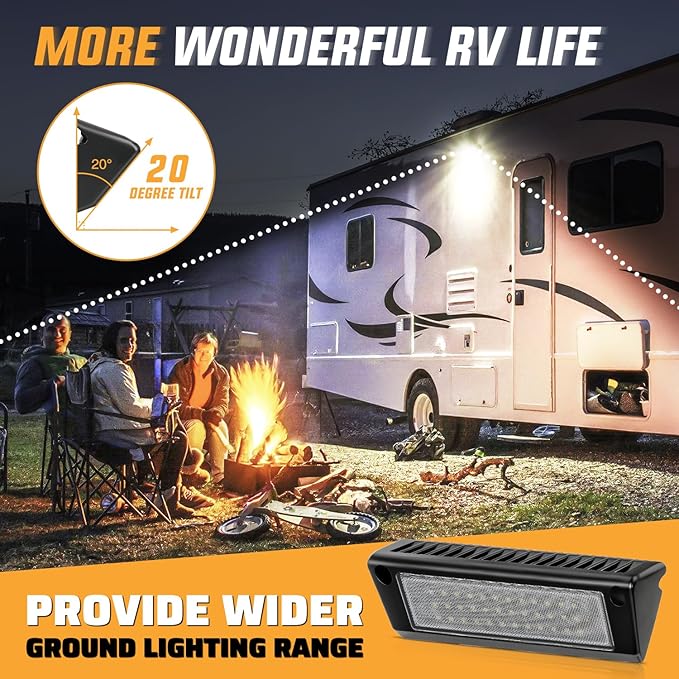 - Excellent Lighting Performance: 25W per light, a combination of 36 pcs SMD LED chips emit 6300-6500K bright white light. With an anti-glare PC lens, the floodlight is soft and widely spread on the side of your RV, bright enough without making people dizzy or uncomfortable, it is an ideal choice for outdoor camping lights
