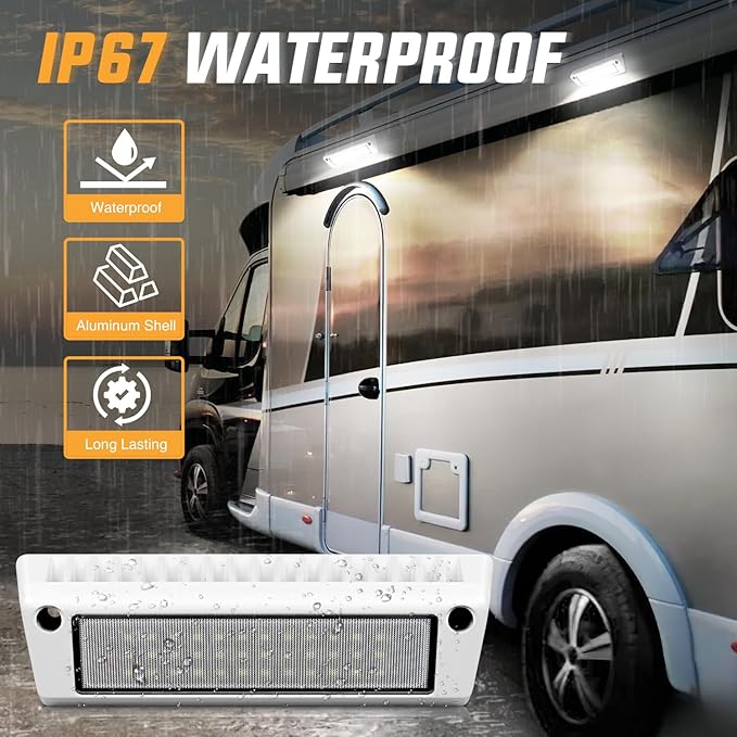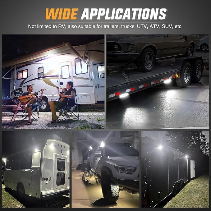 - Wide Application: Fits all 12V, and 24V vehicles, especially RVs, campers, and travel trailers, also suitable for toy haulers, tractor-trailers, cabinets, campers, motorhomes, marine boats, SUV roof racks, fire truck, and can even be mounted to the undercarriage of your vehicle, RV outside lights, RV porch light, food truck lights, roof rack lights, led scene light and cargo trailer lights, etc