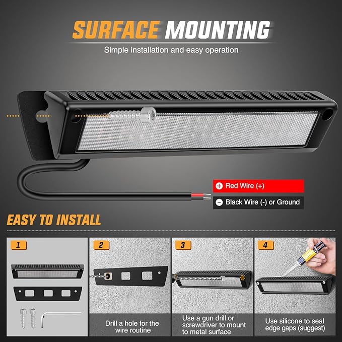 - Easy Installation: Pre-drill a hole for the wiring harness in the area you have selected, then use a gun drill to secure the lights with self-tapping screws. Hard-wire the harness to power the lights (Recommend to use 16AWG wiring harness)