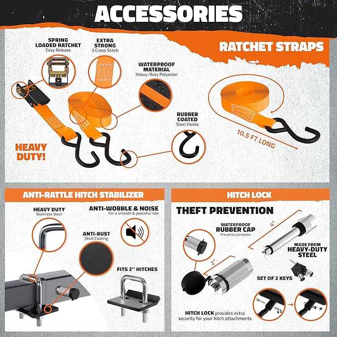 - FULL HITCH MOUNTED CARGO CARRIER SET: Enjoy a durable hitch hauler with a 500 lbs. capacity & a 70"x30"x6" frame with a sleek black finish. This luggage rack for hitch includes a license plate bracket & reflectors for enhanced safety. Secure every payload to the tow hitch rack with adjustable ratchet straps. Plus, the space-saving luggage carrier for SUV & car folds up neatly when not in use. Complete with a hitch lock & stabilizer, our rear hitch cargo carrier provides a safer, smoother trip.