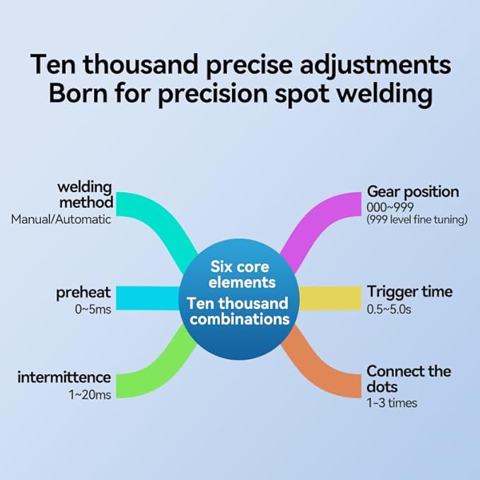 - Wide Application Range: A well made, compact spot welder. Not only for battery pack work, such as cylindrical batteries such as 18650/14500/21700, but even LiFePO4 batteries, industrial batteries, etc. And it can also be used for spot welding of different materials, for example, such as 1.2mm nickel plated sheet, 1.2mm stainless steel sheet, 1.2mm iron sheet, 0.3 pure nickel sheet, 0.2 copper sheet, etc. There are 999 adjustable gears, with different gear requirements for different materials.