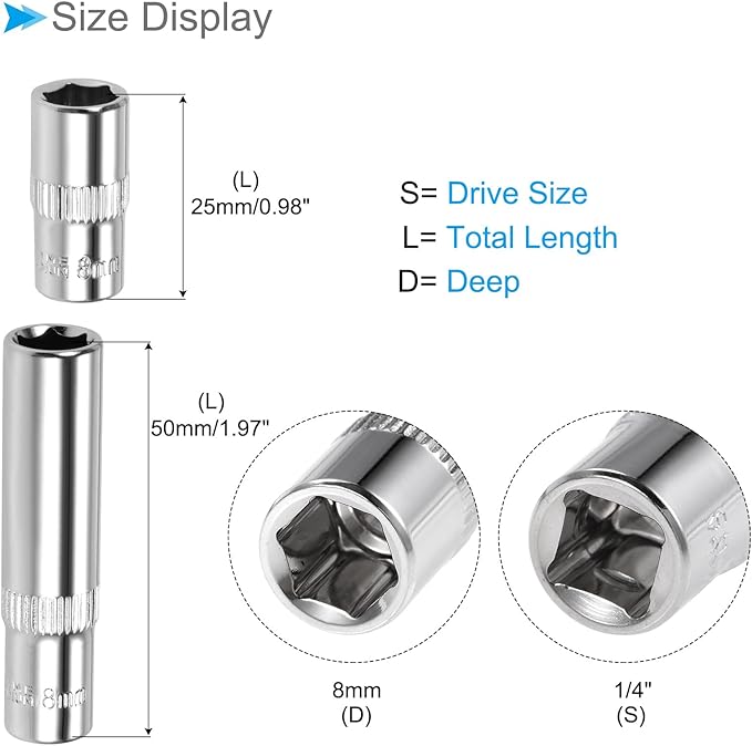 - ★ 6-Point Socket Size --- Drive: 1/4"; Deep: 8mm; Total Length: 25mm / 0.98",50mm / 1.97"; Package includes: 2 x Impact Socket.