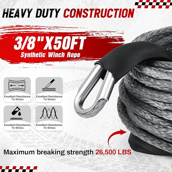 - Heavy-duty Rope Specifications: made from ultra-high molecular weight polyethylene material of 50 feet length and 3/8 inches thickness, this 3/8'' x 50 ft synthetic winch rope provides an average breaking strength of 26, 500 pounds; Suitable for heavy-duty towing tasks, its durability is beneficial for the users
