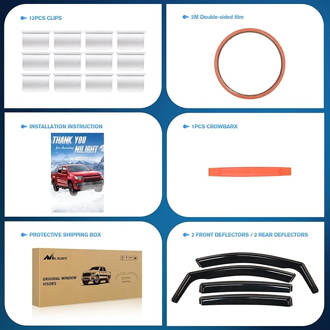 - PACKAGE INCLUDED:4 PCS Rain Guards,12pcs clips,Crowbar 1pcs,78inch double-sided tape and installation instruction